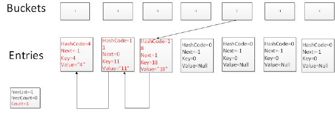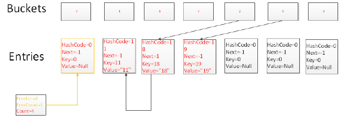 我们添加18,让HashCode再次碰撞到Buckets中下标为4的槽上,这个时候新元素添加到count+1的位置,并且Bucket槽指向新元素,新元素的Next指向Entries中下标为1的元素。此时你会发现所有hashcode相同的元素都形成了一个链表,如果元素碰撞次数越多,链表越长。所花费的时间也相对较多。