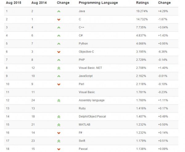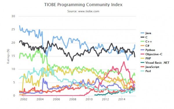 在开始几年,Java没有什么变化。但在2014年Java8的发布是一个巨大的跳跃,现在可以用简介的方式编写Java程序。令人惊讶的是,Java增长的一大部分市场份额,正式Object-C失去的市场份额,但这些市场份额貌似应该是Object-C的继任者Swift所有的。