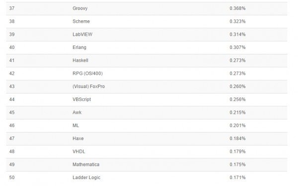 Alice, Apex, APL, AutoLISP, Automator, Bash, Bourne shell, C shell, Caml, CFML, CL (OS/400), Clojure, Common Lisp, cT, Eiffel, Etoys, EXEC, Fantom, Forth, GNU Octave, Go, Icon, IDL, Inform, Io, Ioke, J, JADE, Korn shell, Modula-2, MQL4, MUMPS, NATURAL, NQC, NXT-G, OCaml, OpenCL, Oz, Paradox, PL/I, PostScript, PowerShell, Q, Rust, Smalltalk, SPSS, Standard ML, Stata, Tcl, X10