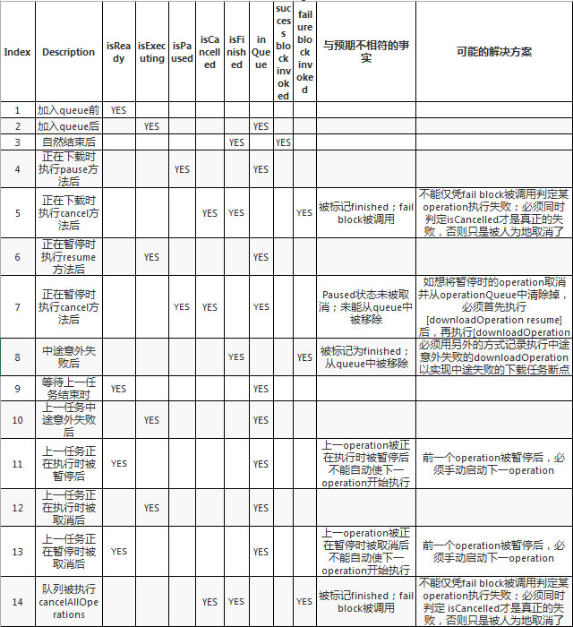 原因在于AFHTTPRequestOperation的父类NSOperation,在设计之处不是为了下载的操作而生的!人家开始仅仅是用来处理多线程的啊!!所以造成了AFNetworking在扩展这个类的时候,可用的资源、接口等等非常少。对于什么下载任务暂停/继续,下载中途失败等等情况,很多问题几乎是没有办法理想地解决的,只好用NSOperation中仅有的几种状态予以并不贴切的表示。于是乎出现了上表中种种诡异的情况