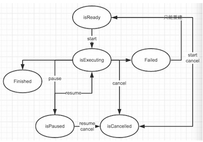 对isReady状态的operation执行resume、pause、cancel等方法是没有任何用处的,所以为了确保执行正确,在对operation执行resume、pause、cancel前,都要首先执行[operation start]。(对已经start过的operation执行start不会造成任何影响)