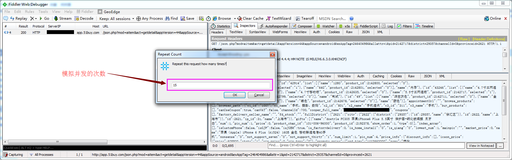 首先我们要获取需要并发的 HTTP请求,此操作非常简单,则在此不再赘述。获取到响应的 HTTP请求后,在 Fiddler 界面按下快捷键【Shift + R】(在大写状态下),会弹出设置模拟并发次数的页面,如下所示:
