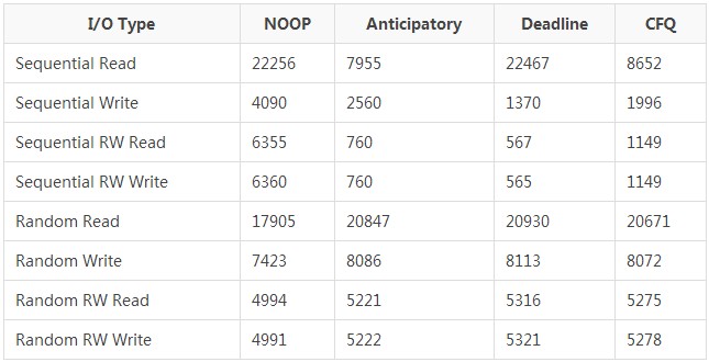 在 SSD 或者 Fusion IO,简单的 NOOP 反而可能是好的算法,因为其他三个算法的优化是基于缩短寻道时间的,而固态硬盘没有所谓的寻道时间且 I/O 响应时间非常短。