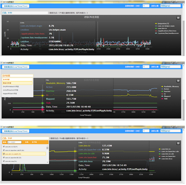 按峰值降序排列显示top5;可多选交互更新;有参数数据的查看点信息时进程同颜色展示;