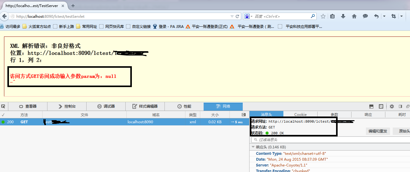 6)启动tomcat服务器,浏览器中输入地址http://localhost:8090/lctest/testServlet,,查看界面,服务端编写成功,