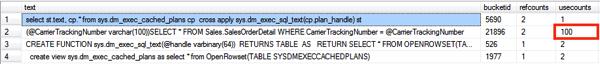 我们是聪明的开发者,因此SQL语句本身被参数化,因为ADO.NET框架是地球上棒的框架,我们使用System.Data.SqlClient.SqlParameterCollection类的AddWithValue方法来提供实际的参数值。我在WHLIE循环里运行那个SQL语句100次,总用不同长度赋予参数值。在Sales.SalesOrderDetail表里CarrierTrackingNumber列定义为NVARCHAR(25)。因此我们可以在基于我们提供的不同字符长度上有上至25个不同数据类型的参数。现在让我们检查下我们SQL语句执行后的计划缓存。