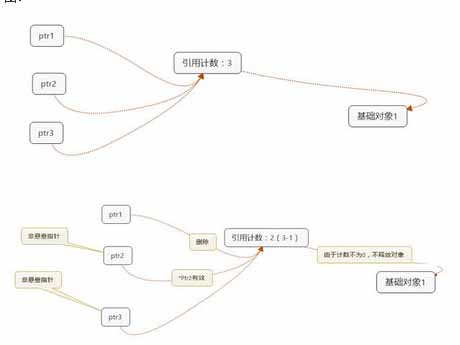 那么何时才可以删除基础对象呢?当然是只有一个指针指向基础对象的时候,这时通过该指针可以大大方方地把基础对象删除了。