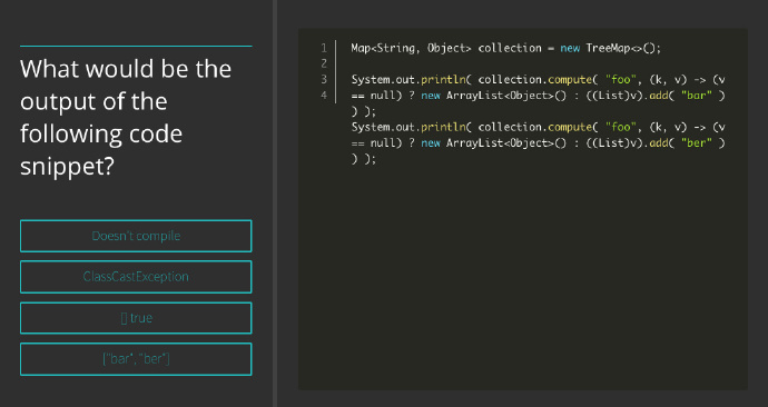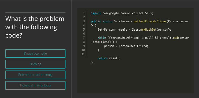 这个问题实际上并不特别需要关于Guava sets类库的专业知识,但却使绝大多数的开发者产生困惑。只有25%的参与者给出了正确的答案,和瞎选的正确率是一样的。
