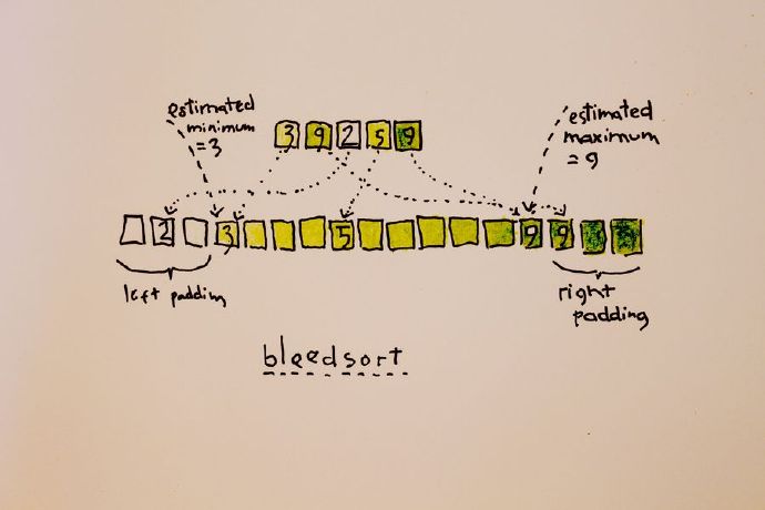 Bleedsort在遇到相同的数据的时候都会放到右边,所以此算法在排序相对一致(译者注:会有很多重复数据)的数组的时候表现很差。所以我需要对排序的数组进行样本估计,当重复数很多的情况下应避免使用Bleedsort算法。