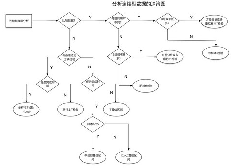 下图为 连续型数据(满意度评分、任务时长)选择统计方法的决策图 。离散型二进制数据(任务完成率)的统计决策图,后面有时间会补上。