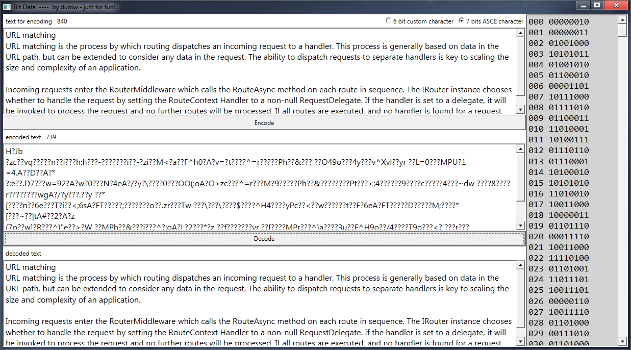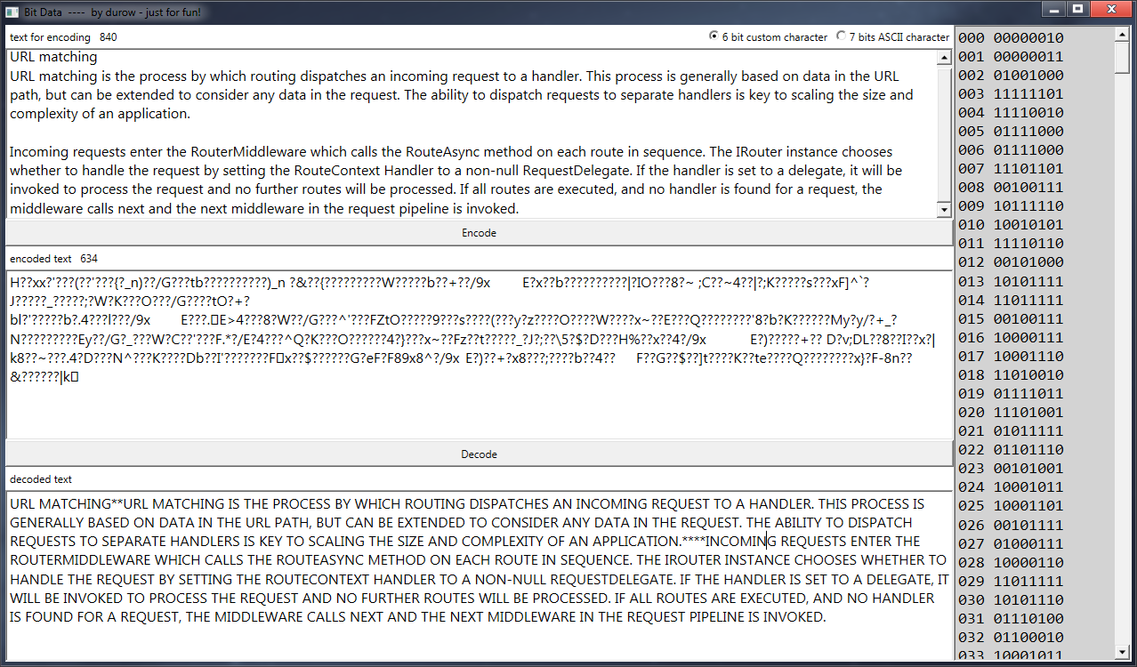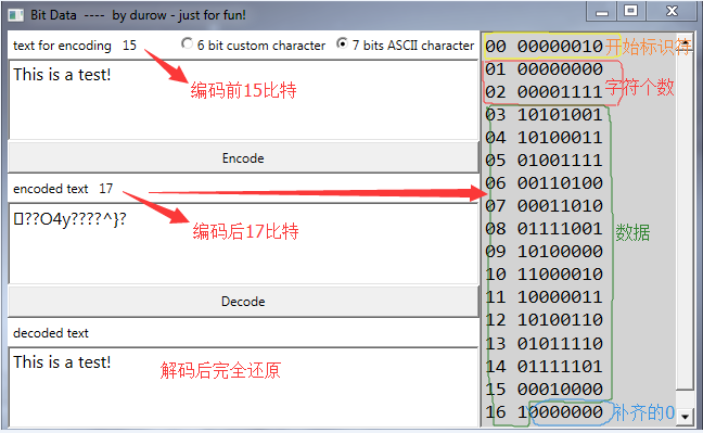以上是我处理比特流数据的一点心得,仅仅是我自己能想到的一种方法,满足了我的需求。如果有更效率的更合理的方法,希望赐教。另外编码和解码的两个例子是出于有趣写着玩的,在实际中估计也用不到。毕竟现在带宽这么富裕,数据加密也有N种可靠的多的方式。