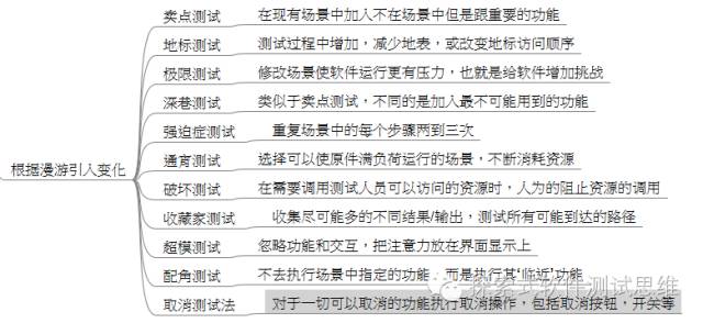 漫游探索模型是通过漫游测试引入变化,这种方法类似于“顺路游”。这种方法的是要求测试人员在需要做决定或者有逻辑分支的地方,先往不同的方向走,然后再返回按照指定的路径走。
