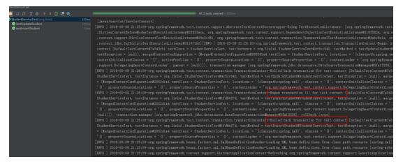 @Transactional注释标签在此测试类中启用了事务支持,这样所有的测试执行完后都会自动回滚,不会在数据库中产生脏数据,不用自己清除所做的任何对数据库的变更了。
