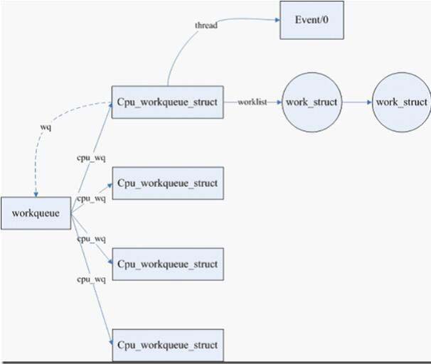 首先需要说明的是workqueue_struct和cpu_workqueue_struct这两个数据结构,创建一个工作队列首先需要创建workqueue_struct,然后可以在每个CPU上创建一个cpu_workqueue_struct管理结构体。