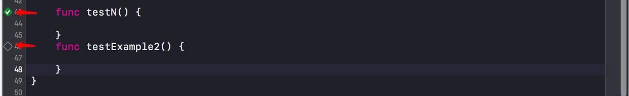 有时候你可能只想运行某条单个测试,而不是Command + U运行当前Test Case所有的测试方法,你可以通过点击跟测试方法名同行位于右侧的小按钮来运行那一条测试: