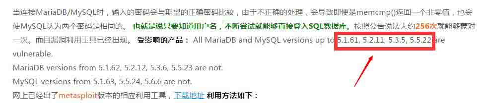 另外,针对某些特定的Mysql版本,也可以采取一些特定的手段,比如Mysql的漏洞:CVE-2012-2122