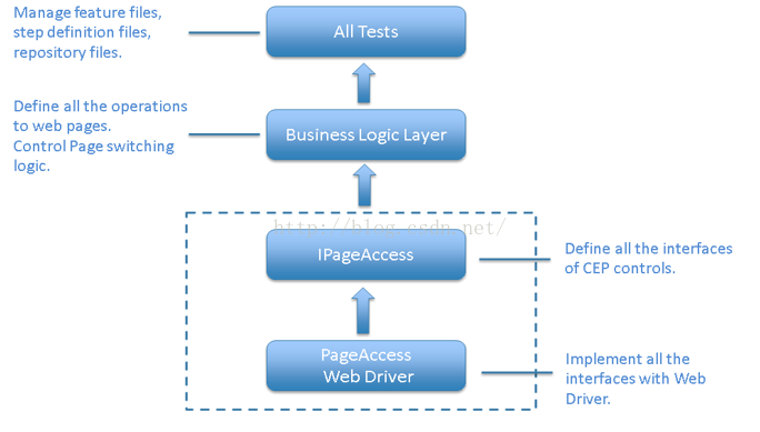PageAccess层即为具体的实现层,实现的方式是通过调用识别的对应控件的对象的相应的方法。实现的方式是webdriver,JS等。在这不详细讨论具体的实现方式了。创建对象时,对象的参数是含有ID,Name等信息的Dictionary,对象要根据Dictionnary提供的信息定位控件,进行相应的操作。