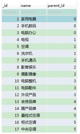 首先,所有分类,都存储在一张表中。表中至少包含3个字段(_id, name, parent_id),分别表示分类的id,分类的名称,分类的父级分类的id,如果是顶层分类,父级分类的id置为0。这样设计和创建数据表,一来容易理解,二来只有一张表,方便管理,三来方便查询,只需一条SQL语句可以查询。而且还可以实现存储无限级分类。