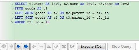 查询时,使用JOIN关联查询,即可使用单独一个SQL语句,查询出某个子分类和它的所有父级分类的名称: