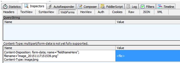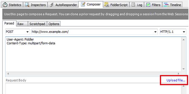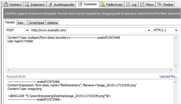 这是fiddler根据我们上传的文件自动调整生成的请求,在请求头中看到,我们需要选择一段数据作为“分割边界”(boundary属性),这个“边界数据”不能在内容其他地方出现,一般来说使用一段从概率上说“几乎不可能”的数据即可。每次post浏览器都会生成一个随机的30-40位长度的随机字符串,浏览器一般不会遍历这次post的所有数据找到一个不可能出现在数据中的字符串,一般都是随机生成。选择了这个边界之后,浏览器便把它放在Content-Type 里面传递给服务器,服务器根据此边界解析数据。下面的数据便根据boundary划分段,每一段便是一项数据。(每个field被分成小部分,而且包含一个value是"form-data"的"Content-Disposition"的头部;一个"name"属性对应field的ID等等,文件的话包括一个filename)