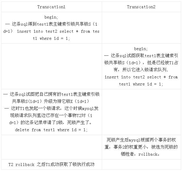 Deadlock occurs here because client A needs an X lock to delete the row. However, that lock request cannot be granted because client B already has a request for an X lock and is waiting for client A to release its S lock. Nor can the S lock held by A be upgraded to an X lock because of the prior request by B for an X lock. As a result, InnoDBgenerates an error for one of the clients and releases its locks. The client returns this error。