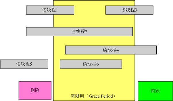 图中每行代表一个线程,下面的一行是删除线程,当它执行完删除操作后,线程进入了宽限期。宽限期的意义是,在一个删除动作发生后,它必须等待所有在宽限期开始前已经开始的读线程结束,才可以进行销毁操作。这样做的原因是这些线程有可能读到了要删除的元素。图中的宽限期必须等待1和2结束;而读线程5在宽限期开始前已经结束,不需要考虑;而3,4,6也不需要考虑,因为在宽限期结束后开始后的线程不可能读到已删除的元素。为此RCU机制提供了相应的API来实现这个功能。