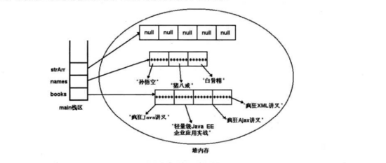 引用类型的数组元素依然是一用类型的,它存储的是引用,指向另一块内存,该内存中存储了引用变量所引用的对象(包括数组和java对象)。