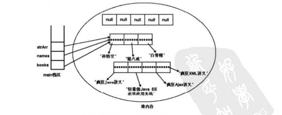 books原本长度为4,现在打印出来的是3,这里只是其引用变了导致的,原来books变量引用的数组长度依然是4,只是没有任何引用了,将会被GC回收。内存变化如下: