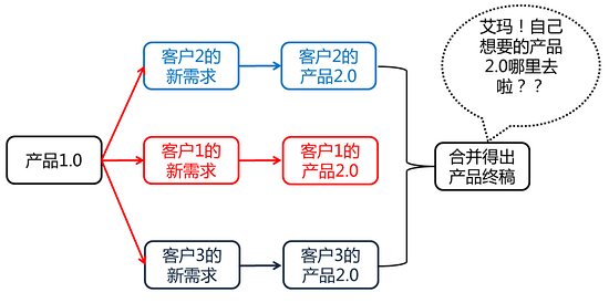 很明显,该图已经表明,后得出的产品是客户1、2、3的合并版本,并非自己原来想要,也不是每一个客户原来想要。如果幸运的话,客户也许不会介意,表示收货,但如果运气没那么好,惨了,客户表示不收货(皓皓试过掉进里面),这是其一。其二,因为不断加需求,没有时间去优化现有产品,导致产品质量越来越差,这也是很多小公司都会遇到的问题。