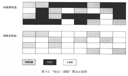 缺点:首先,效率问题,标记和清除效率都不高。其次,标记清除之后会产生大量的不连续的内存碎片,空间碎片太多会导致当程序需要为较大对象分配内存时无法找到足够的连续内存而不得不提前触发另一次垃圾收集动作。