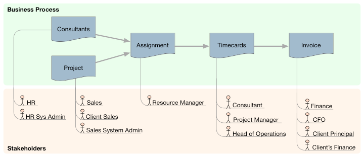 系统用户和他们身边的人可以很容易地干预到项目进程。通过绘制业务价值链和沿着它与用户的每次交互的背后关联的人员。遵循这个流程,我们能够同时识别我们的用户Personae与项目利益相关者。