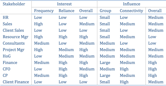 答案可能不是一个简单’不’,但他们为什么又是如何不同于彼此呢?非常流行的利益相关者矩阵建议从兴趣(Interest)和影响(Influence)两方面进行分析。在敏捷项目中,我们可以进一步分析更细致的因素。在我们的示例中,我们认为当用户更频繁地与我们的系统进行交互,以及当他们愈加依赖系统才能完成自己的任务时,他们会表现出对项目成果更强的兴趣。另一方面,每个用户组的人数,和他们与其他各种用户的沟通数量,可以帮助理解影响的层面。然后,将我们在PSA项目中识别出的利益相关者进一步归结如下: