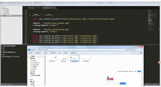 下图为执行的代码(图一对比图二),函数方法说明下(对应方法的代码需调整,待调整完后放出), calc_similar_by_path() 进行两张图片的相似度计算; cropImg() 进行图片裁切,如下,裁切成了4块(如有需要,怎么裁都行),下图文件夹中为裁切完成的图片(实际运用无需保存图片,仅作示例方便查看);下面几个数字分别为对应小图对比的结果,可见仅一块非1,且比之前对比出的0.995小多了,是不同点所在。