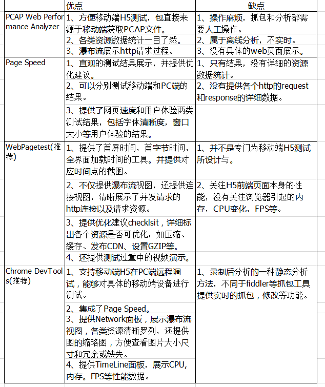 还有一类,这里重点提到的是如Page Speed、PCAP Web Performance Analyzer、WebPagetest这类平台型工具。我们可以快捷的测试出H5前端性能中数据,视图,并给出一定程度的优化建议。