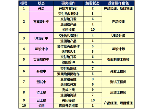 这些可以梳理成表2的形式。表2中,项目管理人员在每个状态都具有操作权限,这里为了强调让团队的每个成员都参与进来使流程运转,所以在“适合操作角色”的内容上,将各个状态对应了各角色的成员。