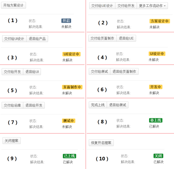 工作流的设计完成后,项目提案中的状态与事务操作对应关系,工作流的JIRA效果展示,如图6所示。