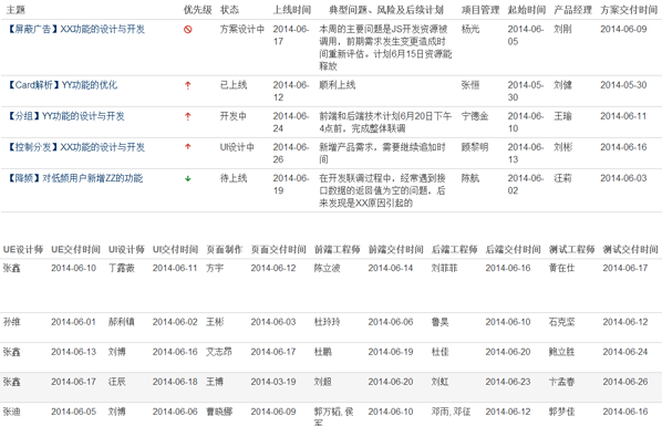 A公司的产品设计开发节奏快、周期短,平时并行的项目较多,除了个别非常重要紧急的项目以外,很少能做到专人专项。UED、开发、测试等职能部门的人力资源多数都是当项目立项后,再被临时指派到各个项目上。项目执行中的状态、时间点等信息也比较散落。想让每个项目的上线时间、资源分配(占用)情况、各环节的交付时间点、以及项目执行中遇到的问题风险等,能一目了然地呈现;能在一个动态的项目报表中看出整个业务分类下的现行项目情况。