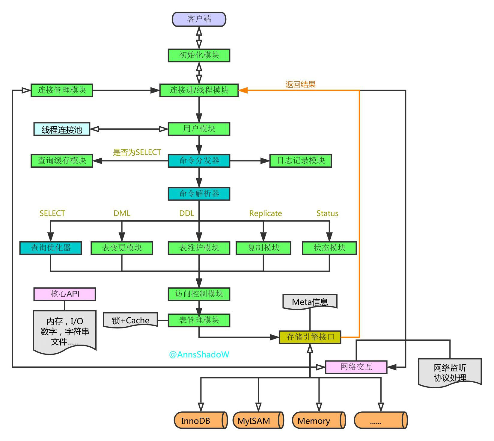 从上图中我们可以看到,整个架构分为两层,上层是MySQLD的被称为的‘SQL Layer’,下层是各种各样对上提供接口的存储引擎,被称为‘Storage Engine Layer’。其它各个模块和组件,从名字上可以简单了解到它们的作用,这里不再累述了。