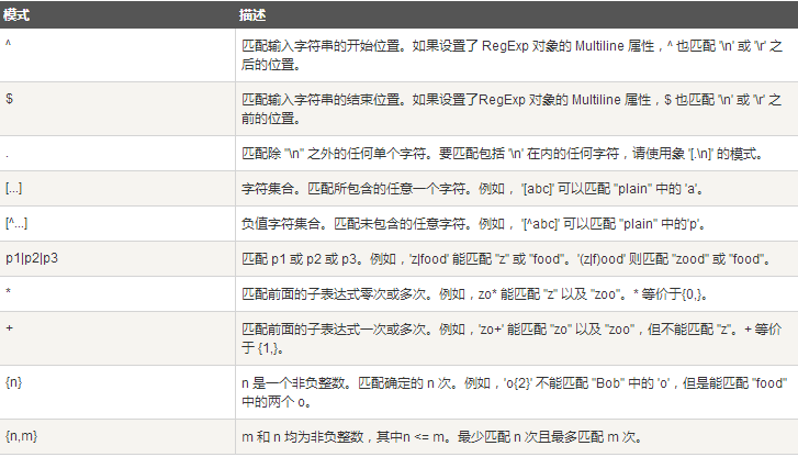 下表中的正则模式可应用于 REGEXP 操作符中。