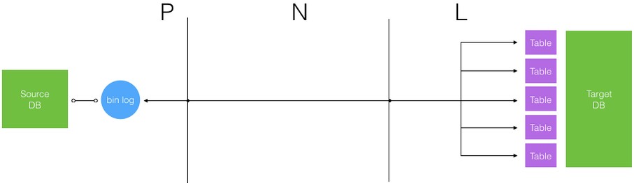 同一个库的 binlog 是顺序的不好并行拉取,传输过程的网络时长也是刚性的,能加速的是入库处理。按业务独立的不同表可以做到并行的多线程入库操作,以缩短 L 的整体时长,如下图所示。