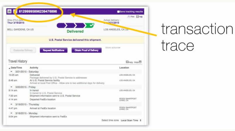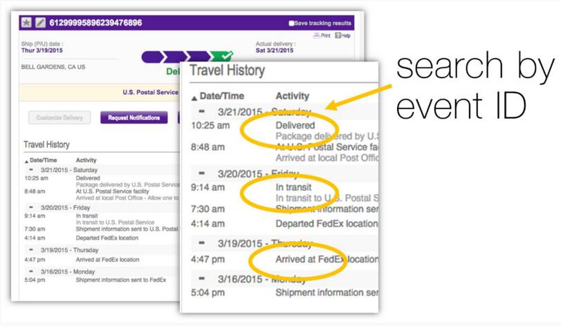 我们大多数人都非常熟悉在线包裹追踪工具。这些工具使我们只要有一个追踪ID能够看到我们的包裹在哪里。这些工具有两个有趣的功能:通过派送网络能够跟踪一个特定的包裹,并且也可以显示出涉及到的这个包裹在不同的时间的各种不同的状态(或事件)。