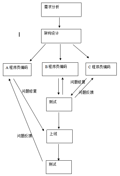 你会发现在流程图中,A程序员是先发上线之后,再进行测试。这是我们一个面向大众用户的网站,上面给于测试人员的定位是测试员兼用户体验员,测试员将发现的bug和体验问题提交到缺陷管理系统,由经理对问题进行分析,指派开发人员解决。定期对系统进行更新。