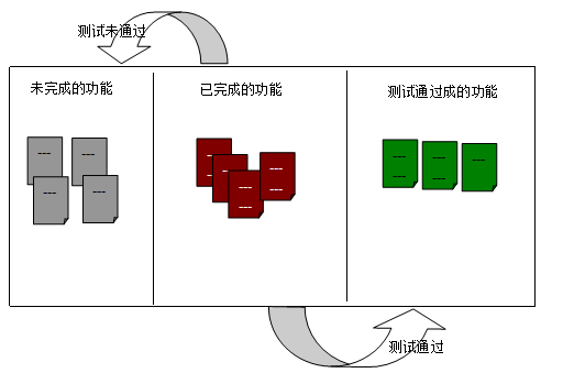 第一块面板中是开发人员未实现的功能,第二块面板中是开发完成功能,测试人员对其进行测试,发现不通过的放回未开发的面板中,测试通过的将放到第三块面板中。