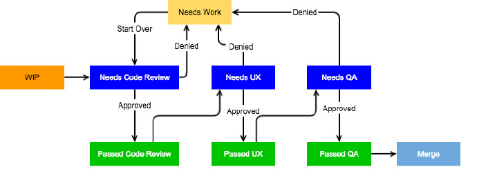 QA小组很小,不过职责重大,要确保我们的代码满足业务需求,别上来崩溃了。我们使用项目管理工具把PR链接到故事,做QA工作的人进行审查时,可以快速地参考相应的验收标准,以及目标和偏差。他们使用开发者提供的关于测试内容的说明,动用他们自己的能力尝试去击垮系统。如果有什么地方不对了或者没有满足验收标准,他们还是移除所有标签,加上”需要修改“标签,这样在开发者实施修改之后几乎总是会强制带来新一轮的代码审查(通常只是修改部分)。当所有事情都做完,运行良好,代码会得到一个”Passed QA“标签,然后会被合并到我们的发布候选分支。到此代码会终提交给项目master,并在QA和产品团队决定发行版中应该包含的特性和bug修复后提交产品化。