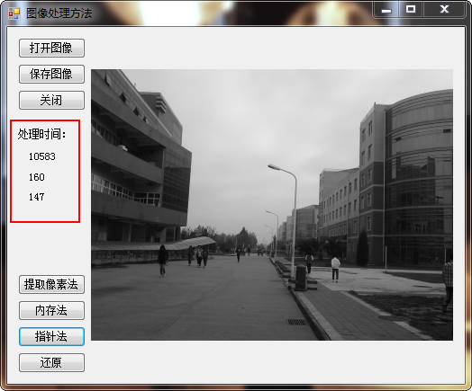比较一下可以得出结论,提取像素法比较简单,但是效率比较低;内存法效率有了很大的提高,但是代码比较复杂;指针法效率比内存法更高一些,但是不安全。综上比较结果内存法比较好,效率即高又能发挥C#安全的优点。
