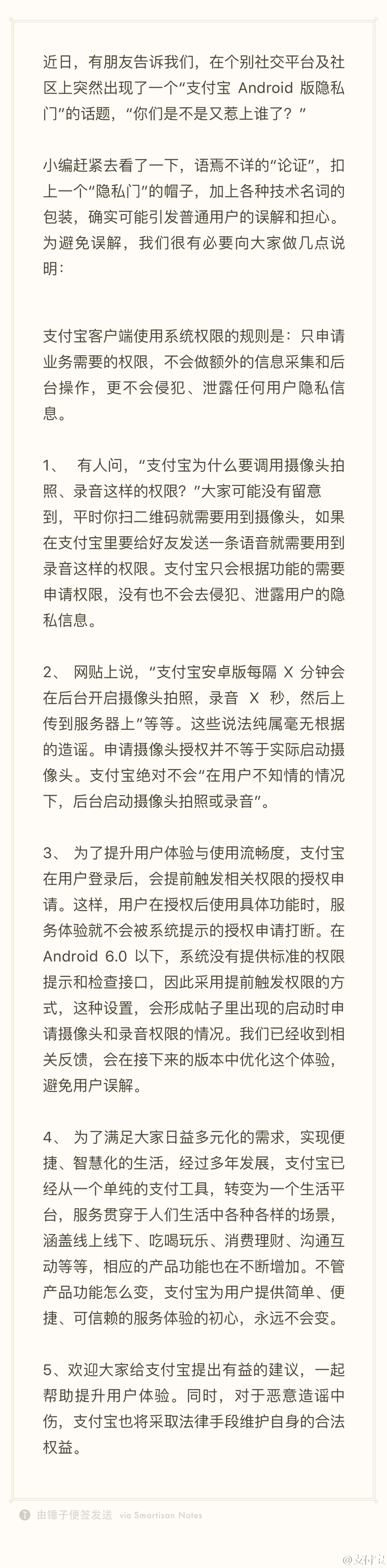 针对上述言论和质疑,支付宝刚刚作出回应表示,支付宝客户端只申请业务需要的权限,不会做出额外的信息采集和后台操作,更不会侵犯泄露任何用户的隐私信息。