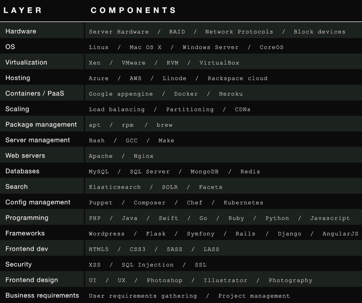 看到这里你一定会问,到底需要具备怎样的技能才能成为一名全栈工程呢?下面这张图来自Medium,作者将软件开发所涉及的各个方面分为层,又将每个层所包含的主要技术作为组件,制作了这张全栈技术图。
