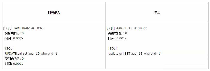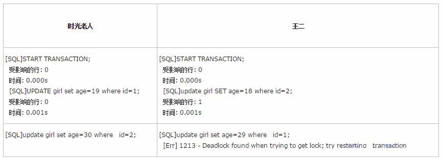 如果凑巧,两个事务都执行了第一条update语句,分别修改了王一和王三的年纪,同时也锁定了改行语句,接着,每个事务都尝试执行第二条语句时,却发现该行已被对方锁定,然后两个事务都在等待对方释放锁,同时又持有对方需要的锁,则陷入死循环。