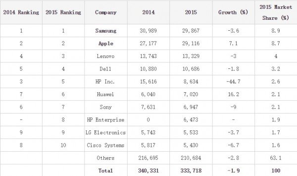 据科技网站PhoneArena报道,近日,市场研究公司Gartner发布了一份全新报告,该报告对2015年各大厂商的芯片消费量做了一次详细的梳理,从这份报告中我们可以得出许多有用的信息。作为统治手机市场的两家超级巨头,三星和苹果无悬念的排在前两位,这两个老冤家的缠斗已经持续了五个年头了。统计数据显示,三星和苹果的差距进一步缩小,两家共消耗了全世界17.7%的芯片。