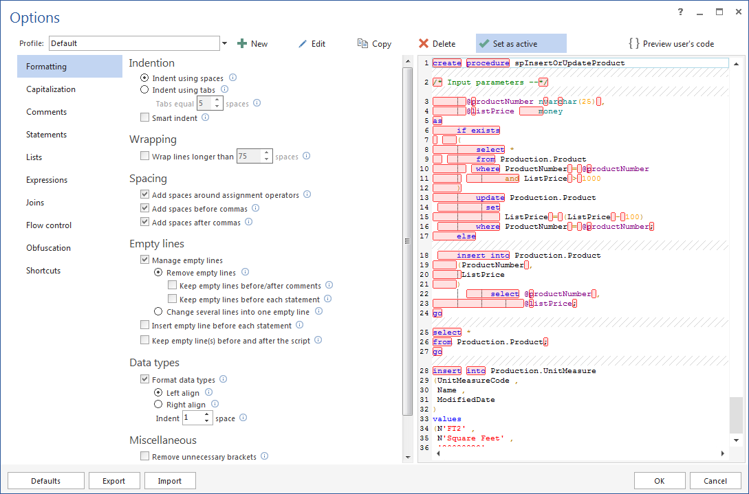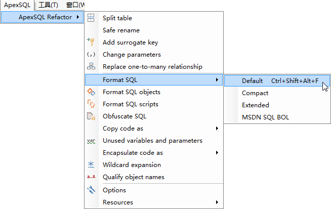 可以看到默认格式化的快捷键是Ctrl+Shift+Alt+F,好在默认格式的配置(ApexSQL菜单下的Options...)可以修改: